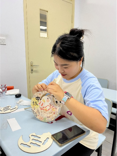 手工花灯 DIY 环节则聚焦传统节日文化体验。从组装灯架到装饰灯面纹样、点缀流苏,同学们专注投入,用创意赋予花灯独特灵魂,每个人的脸上都洋溢着属于这个中秋的愉悦笑容。当一盏盏亲手制作的花灯点亮时,同学们脸上洋溢着成就感,这些花灯不仅是中秋节日的装饰,更成为承载新生校园初记忆的“专属信物”。