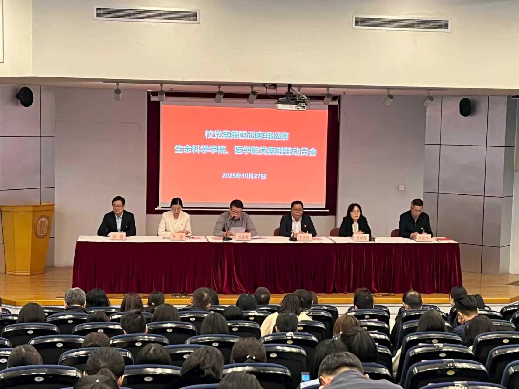 根据校党委统一部署,2025年10月27日下午,校党委第四巡察组巡察生命科学学院、医学院党委进驻动员会在校本部行政楼报告厅召开。校党委常委、副校长王从春,校党委巡察工作领导小组成员、巡察工作办公室常务副主任崔海霞,校党委第四巡察组组长刘建勇,副组长张印兰、宋国栓及巡察组全体巡察干部,巡察办有关同志,生命科学学院、医学院党政领导班子、党委委员、各党支部书记、专业负责人,学科带头人,校党代会及教代会代表、工青妇组织负责人,民主党派代表,教师代表、学生代表,及退休教职工代表等100余人参加会议。崔海霞主持会议。