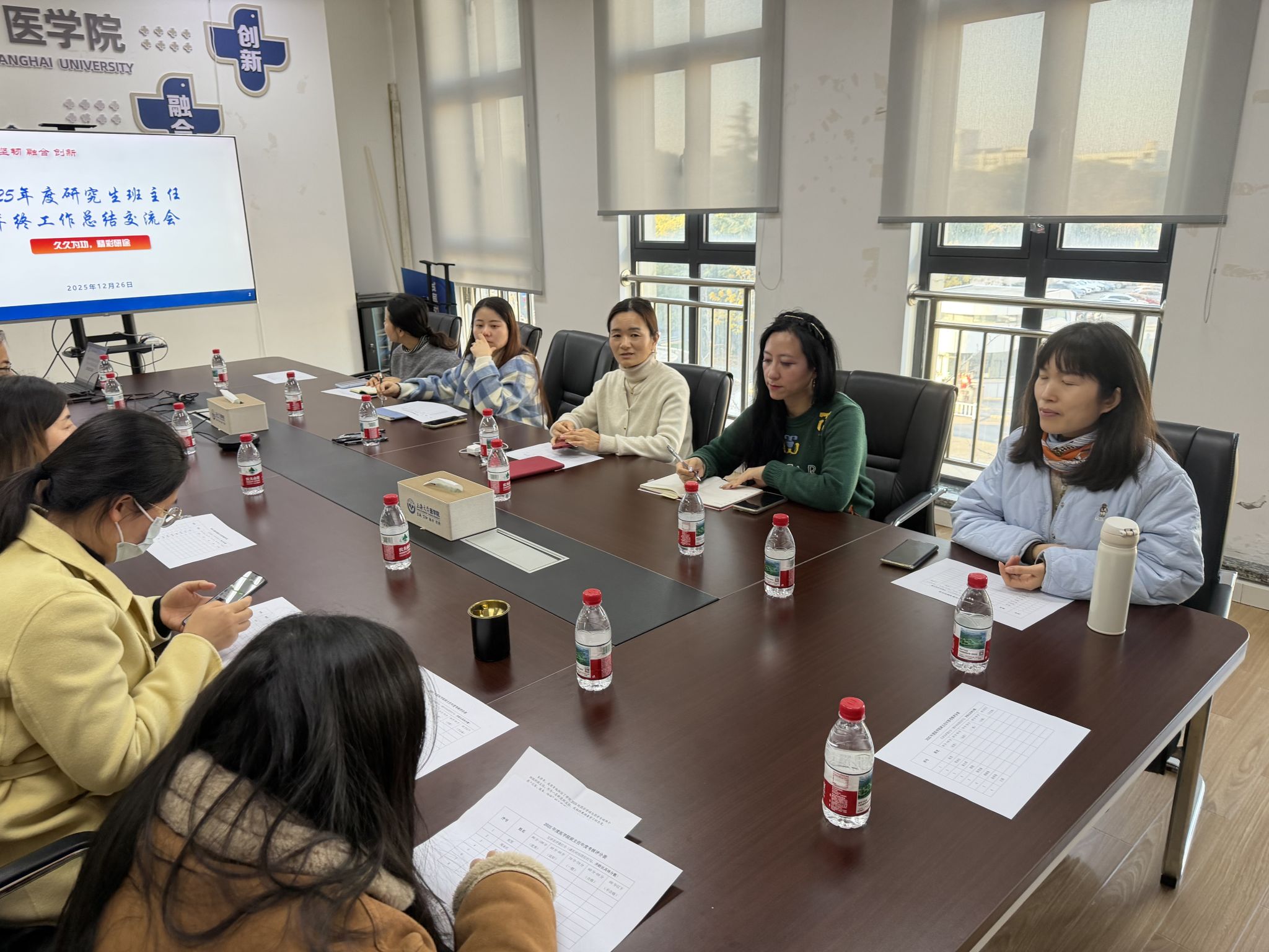 为进一步加强研究生班级规范化管理,充分发挥班主任队伍在研究生思想政治教育与管理服务中的重要作用,全面提升育人实效,医学院于2025年12月26日下午,在东区3号楼317会议室组织召开了2025年度研究生班主任年终工作总结交流会。学院党委副书记、副院长盛晓娜,研究生班主任高明春、王娟、陈雪瑞、胡晓春、崔白萍、韩胜、张雪、周永红,教务秘书闻静,研究生专职辅导员匡可风、李恒康以及各班级学生代表共同出席了会议。