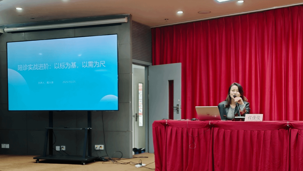 理论学习环节特邀大场医院陪诊师程佳俊和社工部王怡静老师分别作《陪诊实战进阶:以标为基,以需为尺》和《陪诊照护:仁济医院宝山分院的实践与创新》的专题分享。程医生在分享中强调,“以标为基”即构建标准化陪诊服务体系,确保陪诊服务的专业性与安全性。“以需为尺”则强调以群众实际需求为导向,提供个性化、人性化的陪诊解决方案,避免“一刀切”的服务模式。王怡静老师向全体党员系统介绍了大场医院的建设发展的历史脉络以及在陪诊照护领域不断探索创新的最新成果。两位专家的精彩分享帮助与会党员,特别是研究生党员们全面了解了大场医院在陪诊照护领域专业规范的实操流程和最新研究进展,进一步强化了全体党员对基层医疗服务重要性的认知。